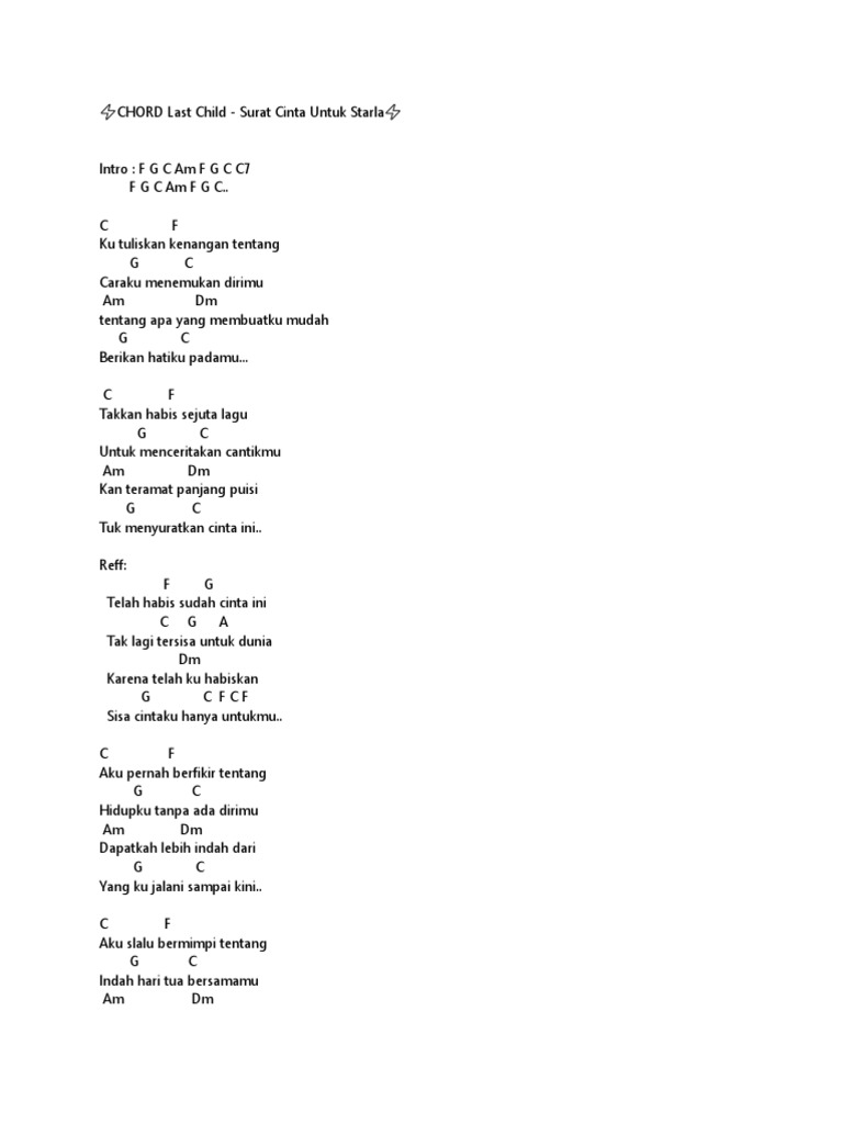 C f kutuliskan kenangan tentang g c caraku menemukan dirimu am dm tentang apa yang membuatku mudah g c berikan hatiku padamu. Learn to play with piano, guitar and ukulele in minutes. G c tuk menyuratkan cinta ini. F#25 b26 9untuk menceritakan cantikmu g#m27 c#m28 10kan teramat panjang puisi. D g untuk menceritakan cantikmu em am kan teramat panjang puisi. G c takkan habis sejuta lagu d g untuk menceritakan cantikmu em am kan teramat panjang puisi d g. G d etak lagi tersisa untuk dunia. C#m karena telah ku habiskan. Di lengkapi dengan lirik lagu. F#29 b30 11tuk menyuratkan cinta ini 12 13 14chorus. Show us your talent, perform surat cinta untuk starla chords! C f takkan habis sejuta lagu g c untuk menceritakan cantikmu am dm kan teramat panjang puisi g c tuk menyuratkan cinta ini. C g a tak lagi tersisa untuk dunia.